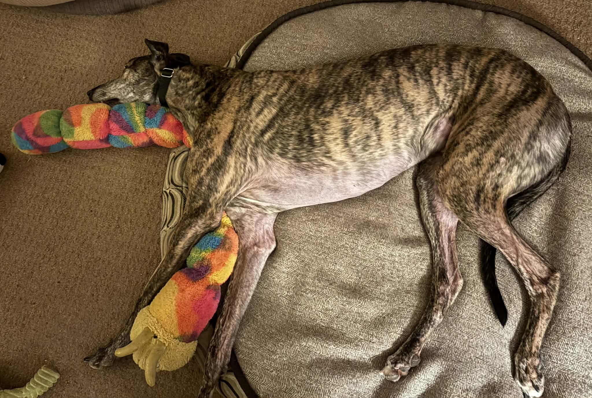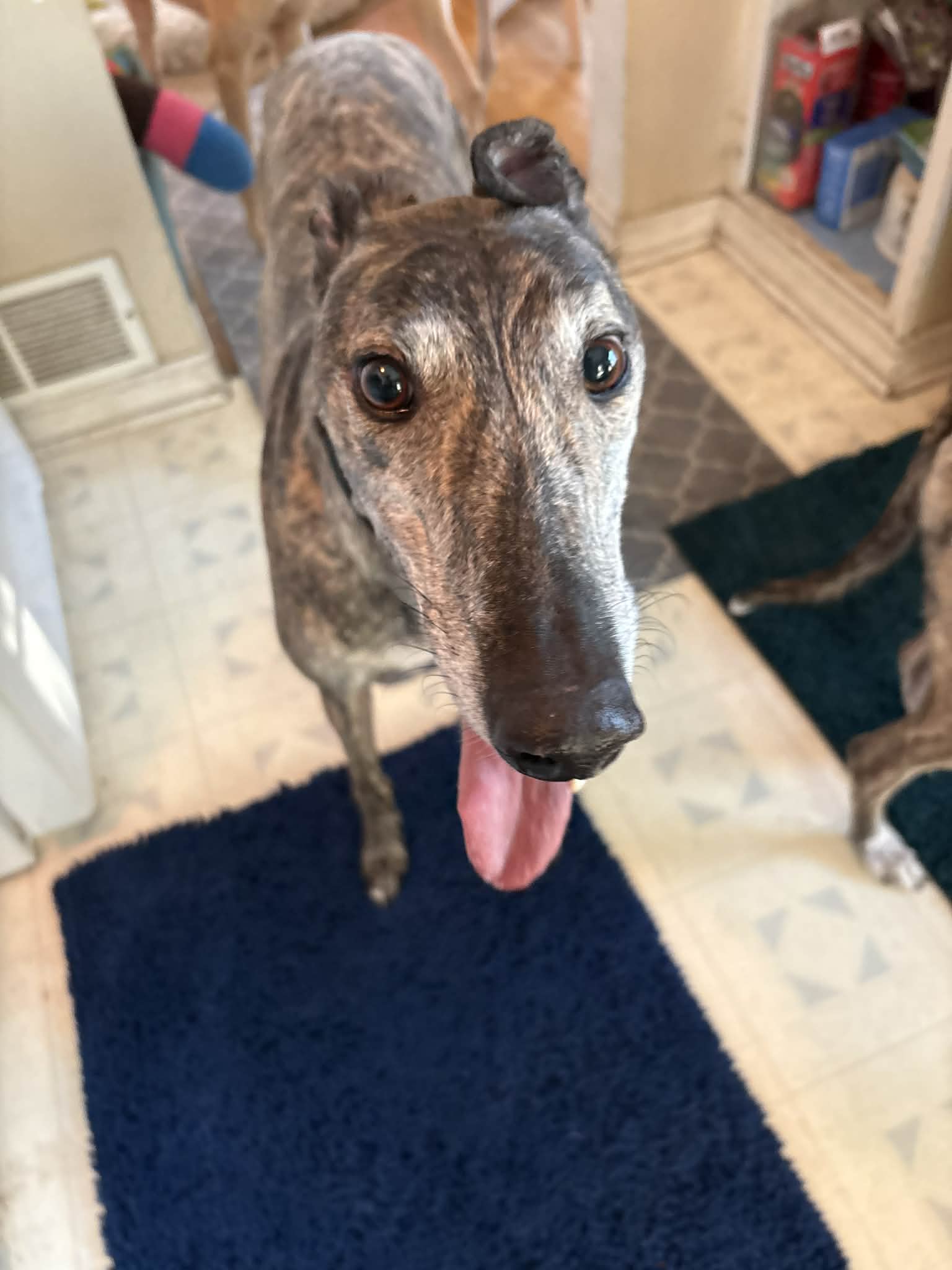 Power recently came to us from across states to find a new home after his owner was no longer able to take care of him. He didn’t race and is a sweet, friendly boy. He’s recently entered a foster home so we will have updated information about this beautiful brindle soon!
