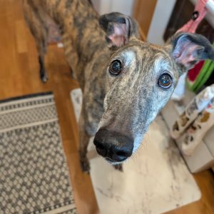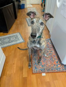 Gal has been recently returned through no fault of her own. Gal has come into retirement with 81 wind blown races. She does have an old racing injury but it doesn’t bother her much. She likely would be better in a house with other dogs. Gal is a laid back easy going girl, but does have a playful streak. She does love to play in the kiddie pool and water…so she is a beach bunny!