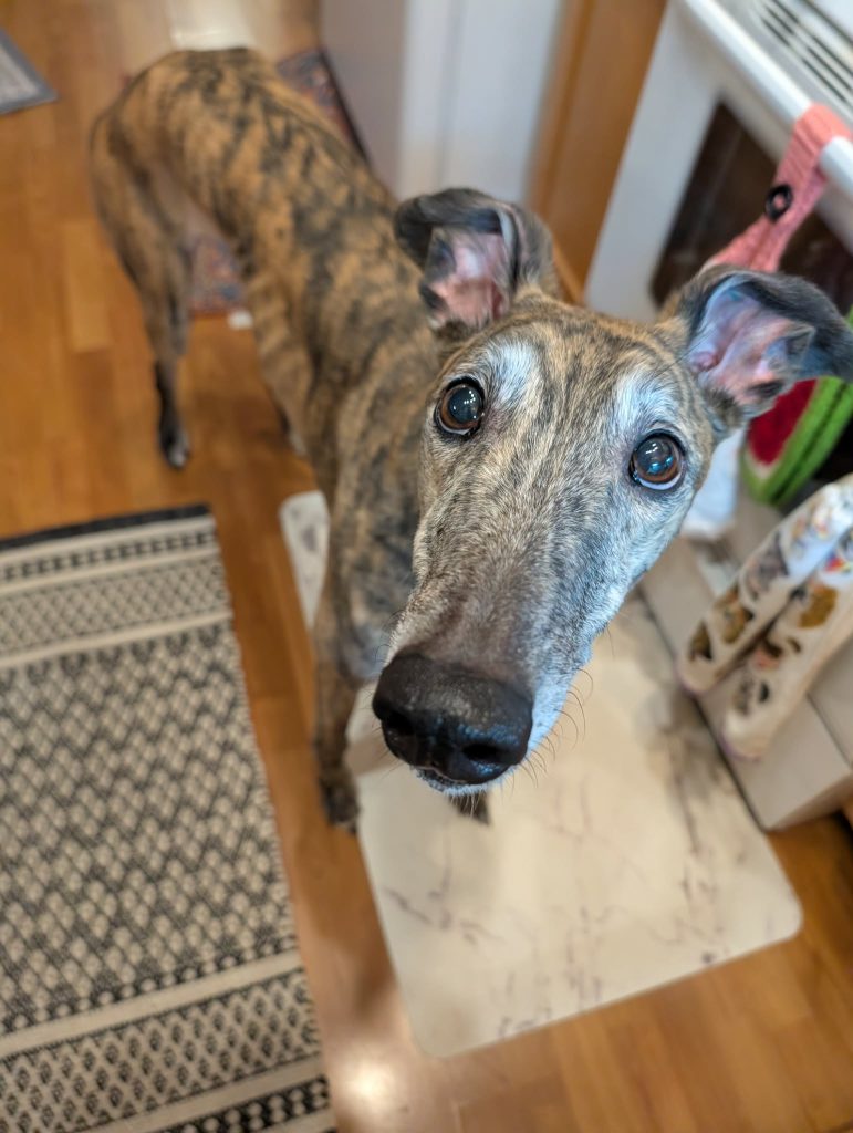 Gal has been recently returned through no fault of her own. Gal has come into retirement with 81 wind blown races. She does have an old racing injury but it doesn’t bother her much. She likely would be better in a house with other dogs. Gal is a laid back easy going girl, but does have a playful streak. She does love to play in the kiddie pool and water…so she is a beach bunny!