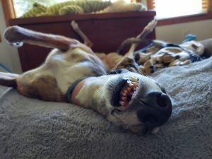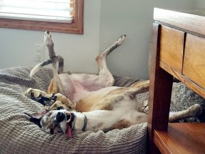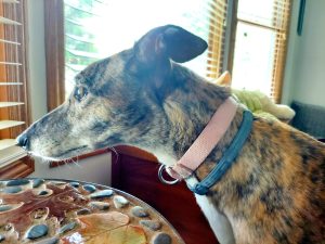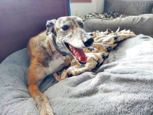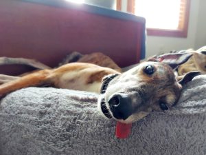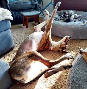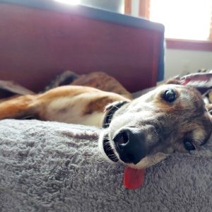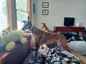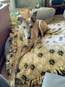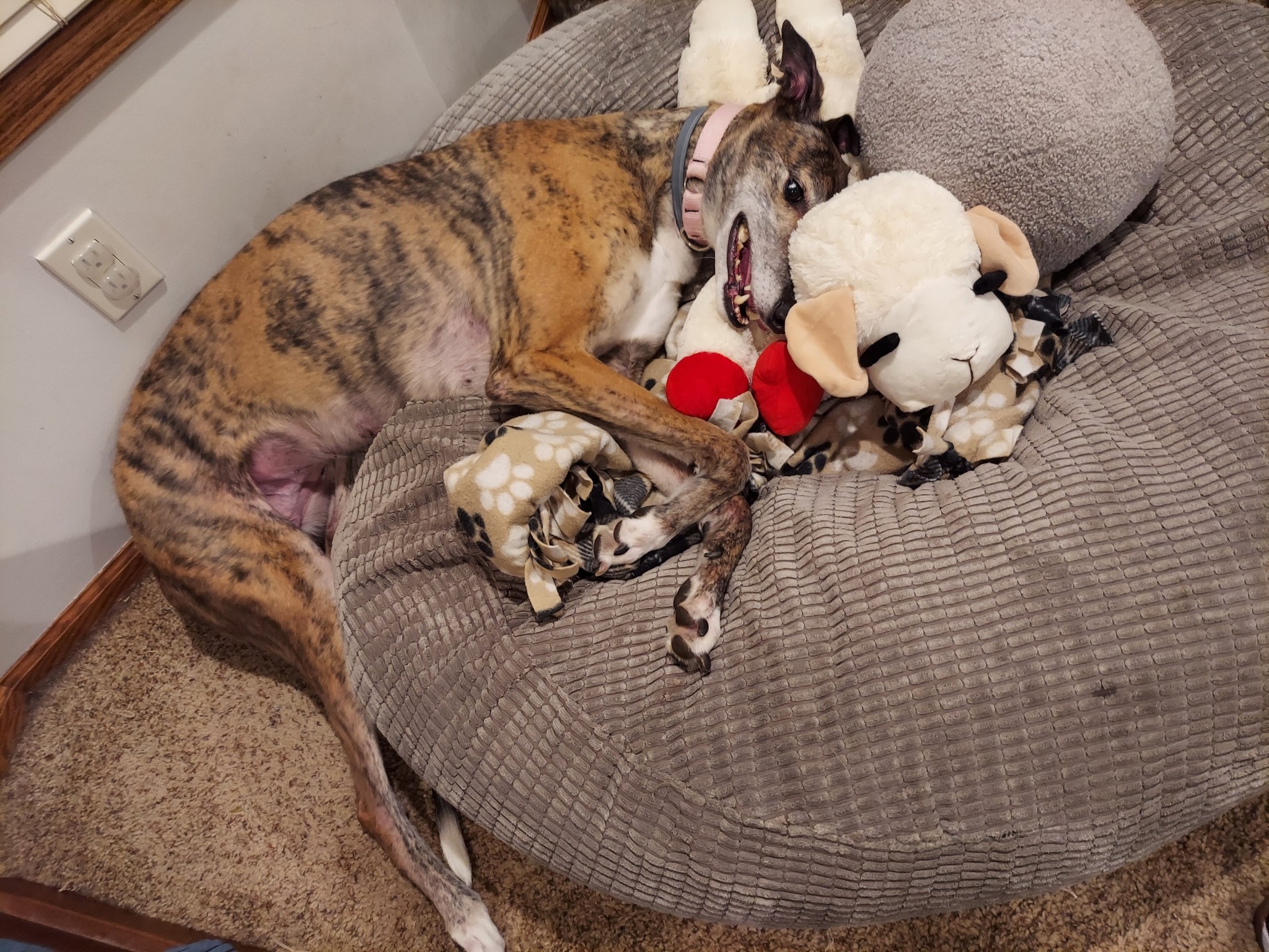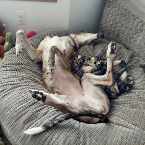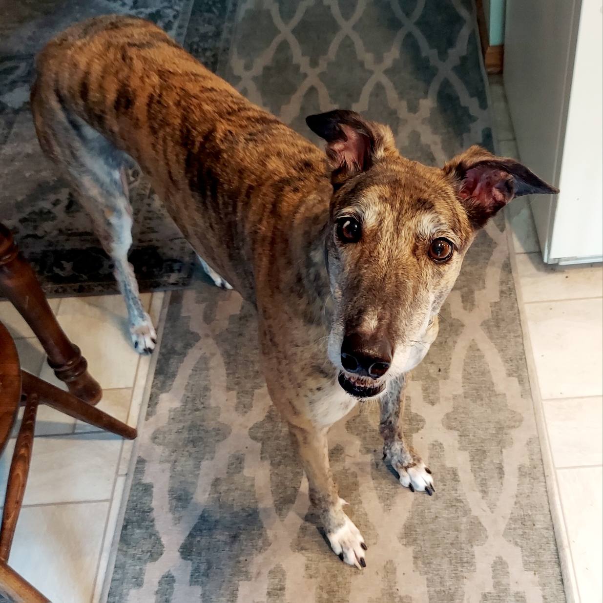 Lela gets along well with the other greyhounds and the cat in her foster home and respects their space, but she definitely wants her share of attention from her humans! She can be a little bossy when she wants something, and her mama dog instincts sometimes make an appearance. She would do well with other dogs or as an only dog in the home. At meet and greets she has been interested in people and other animals and is polite when greeting them.