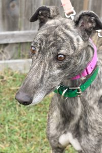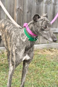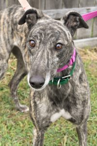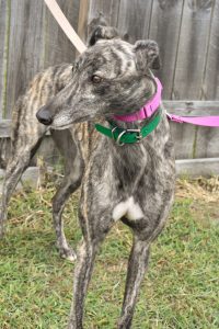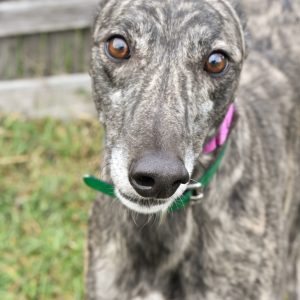 This sweet girl is large and in charge– but actually very easygoing. She was in 56 races before coming to us here at AFG. This adorable girl is ready to curl up on her new dog bed!