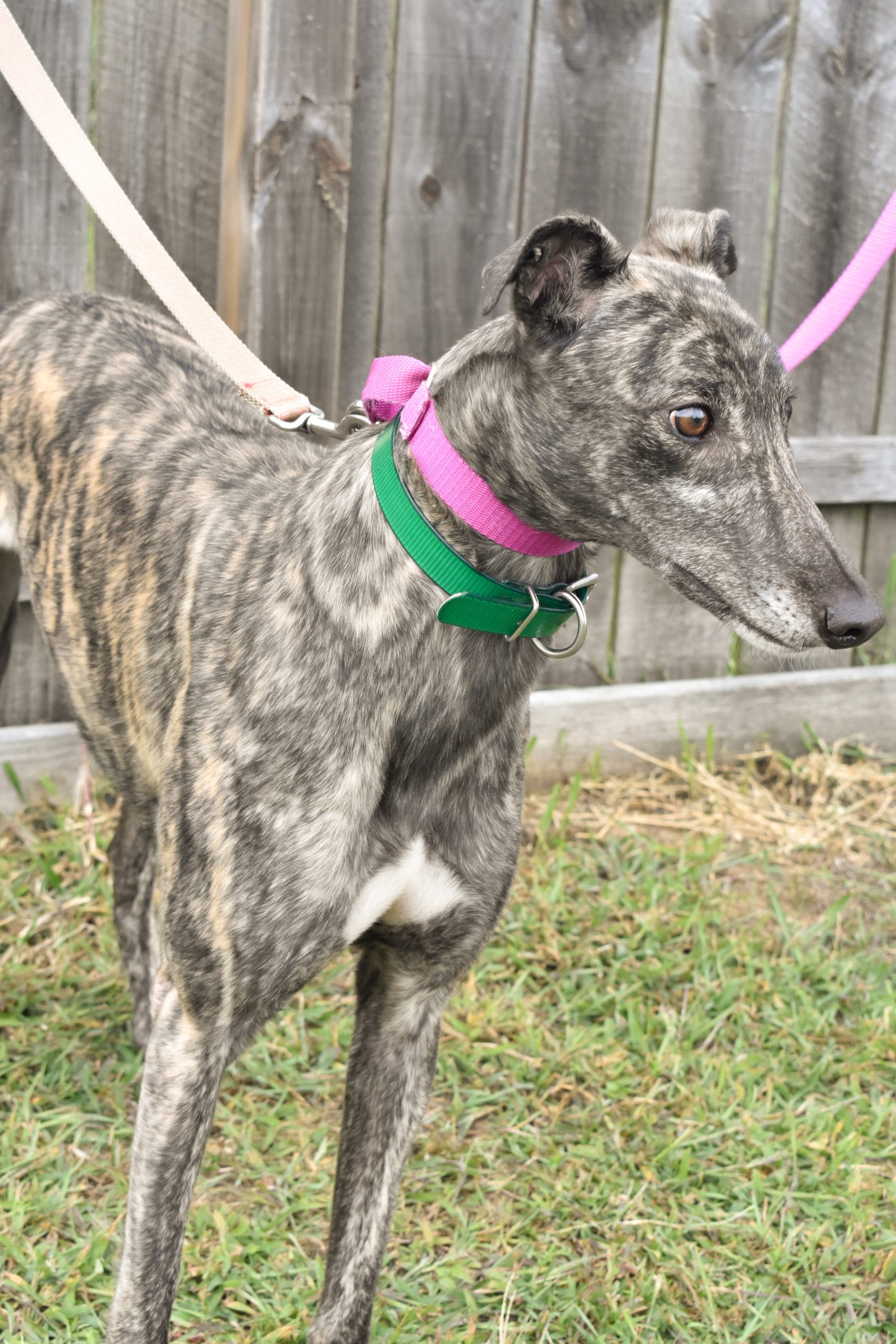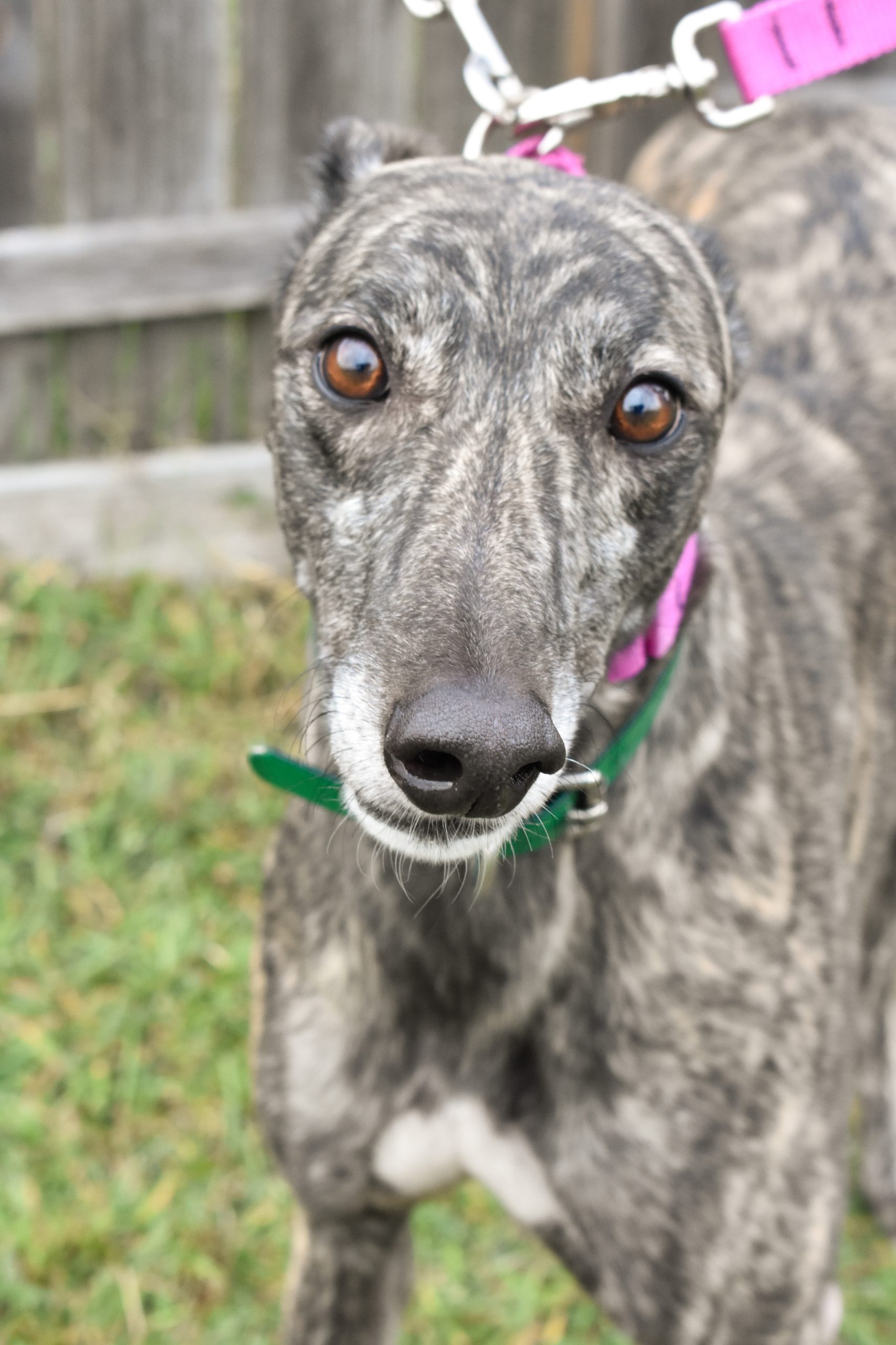 This sweet girl is large and in charge– but actually very easygoing. She was in 56 races before coming to us here at AFG. This adorable girl is ready to curl up on her new dog bed!