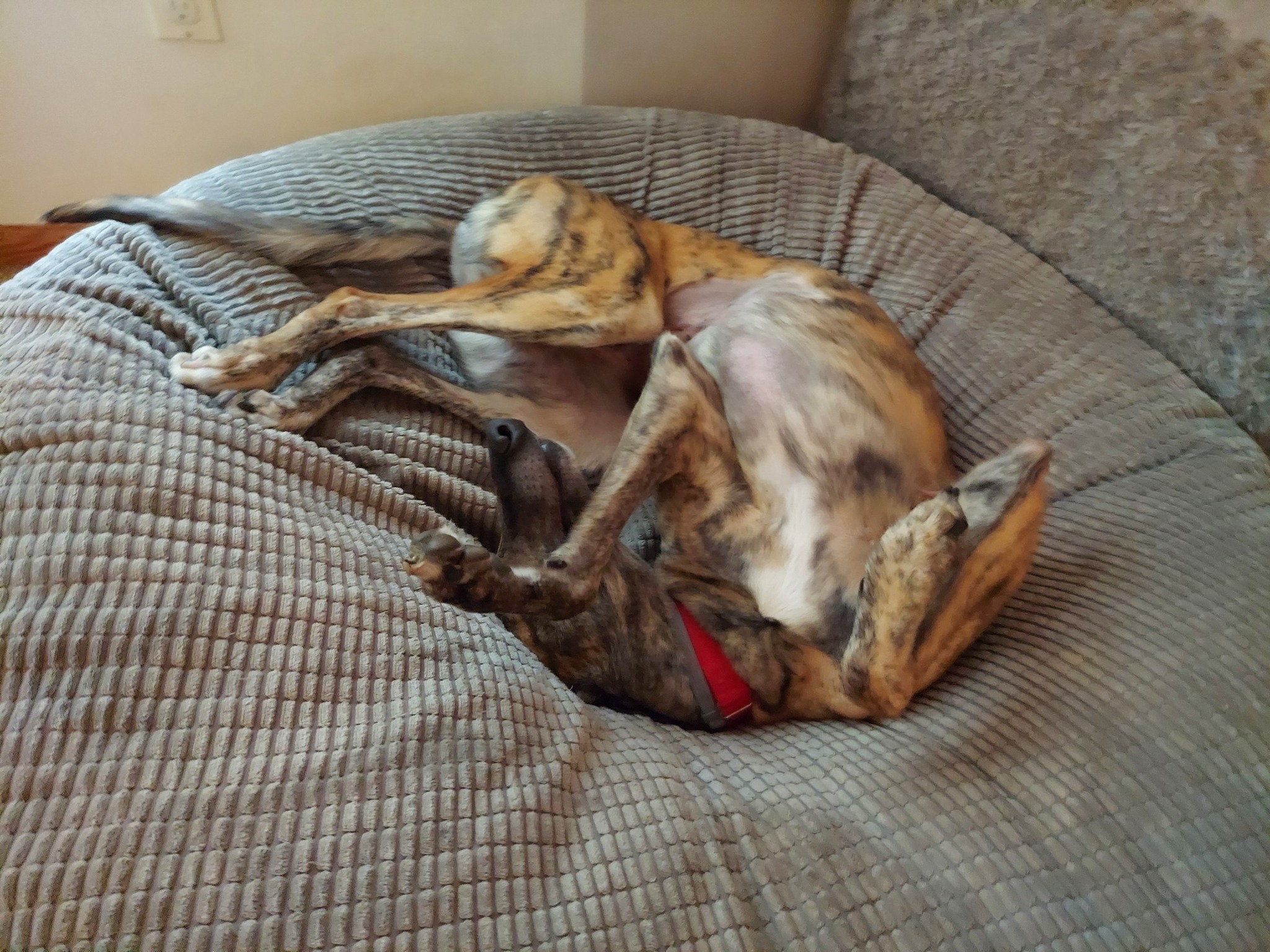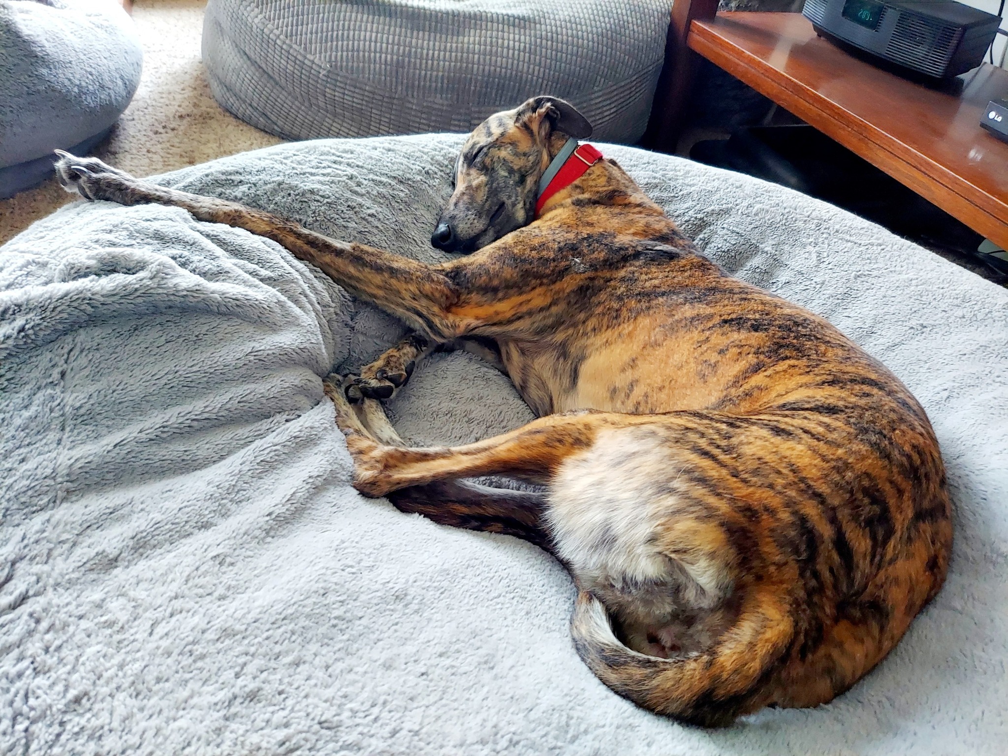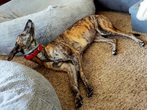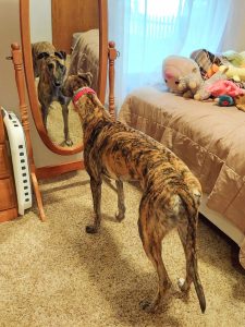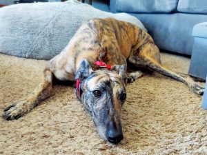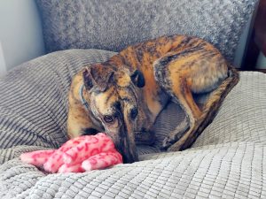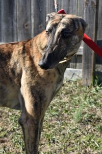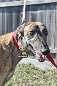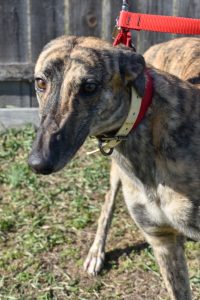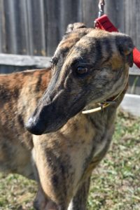 She is settling in well at her foster home, and she gets along with the 2 resident greyhounds. She doesn’t love it when the larger male hound stands over her and has no problem being a little bossy about establishing her boundaries. She enjoys playing friendly games of chase in the yard, and she has also had several friendly conversations with the neighbor’s (non-greyhound) dog. She is interested in the cat in her foster home, but she hasn’t demonstrated any aggression toward him (mostly, she wants to sniff him and steal his treats). She would do well in a house with other greyhounds, but she is confident enough to do well as an only dog if she isn’t left alone at home for long stretches of time.