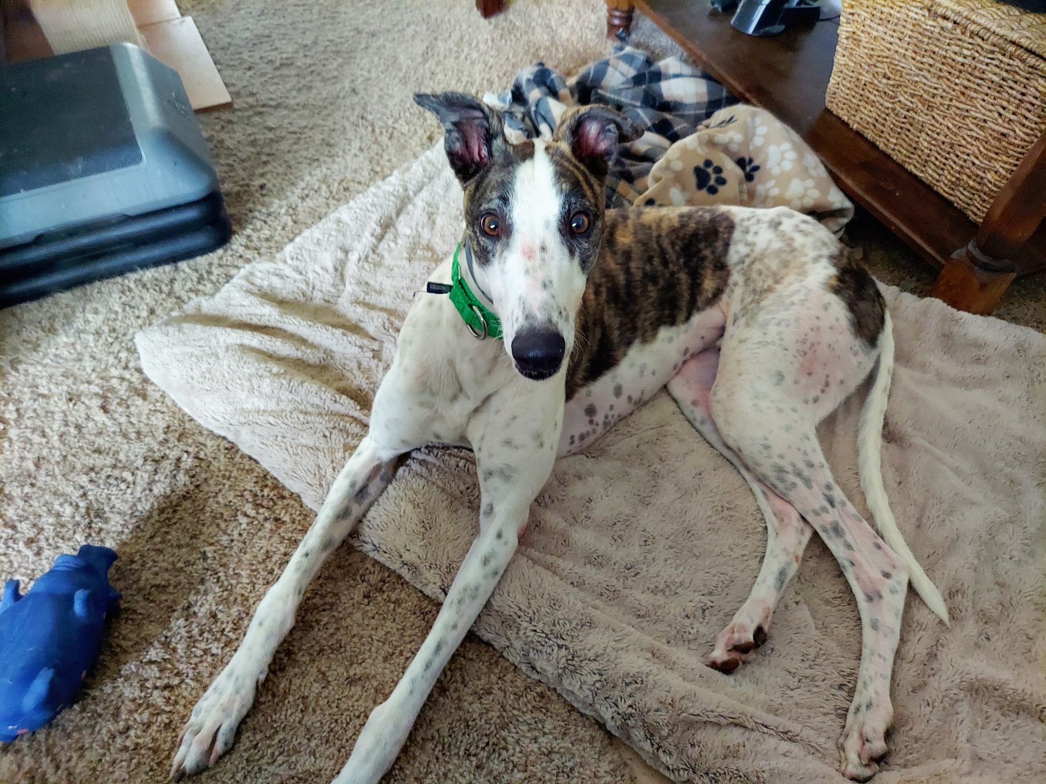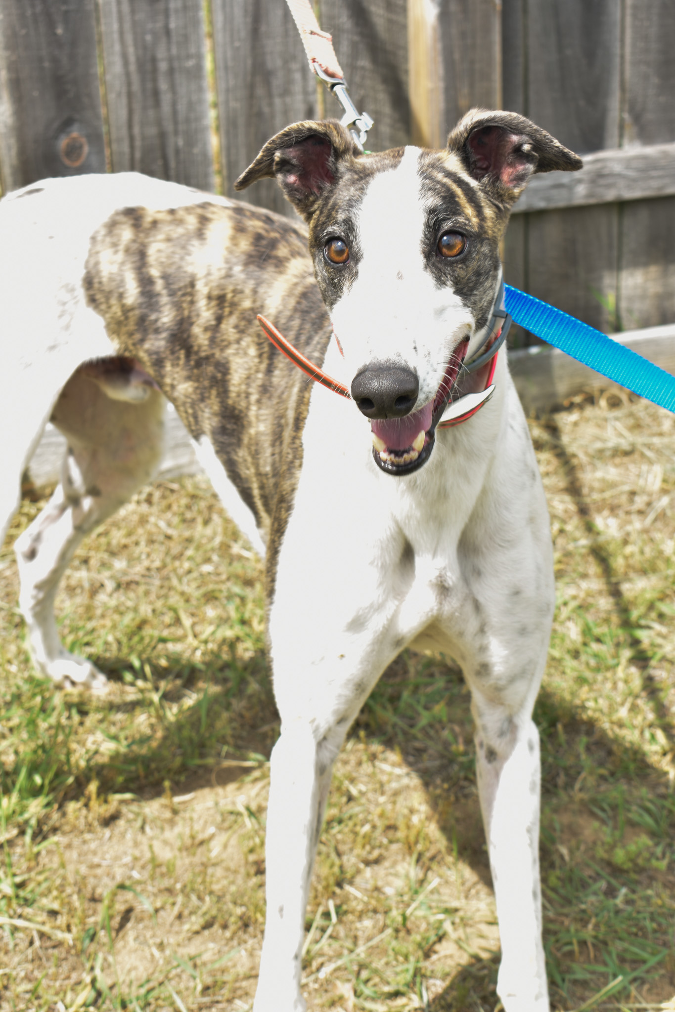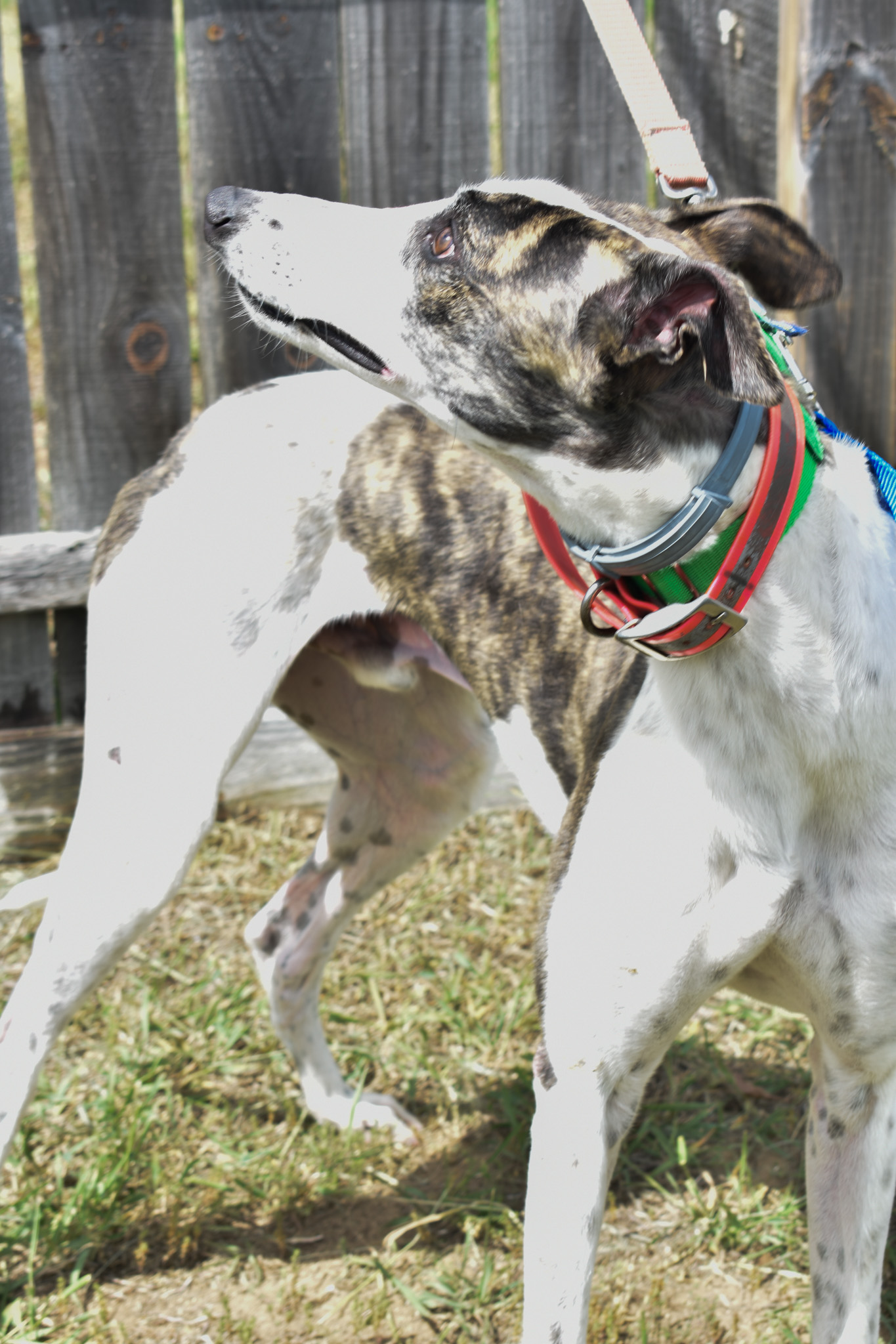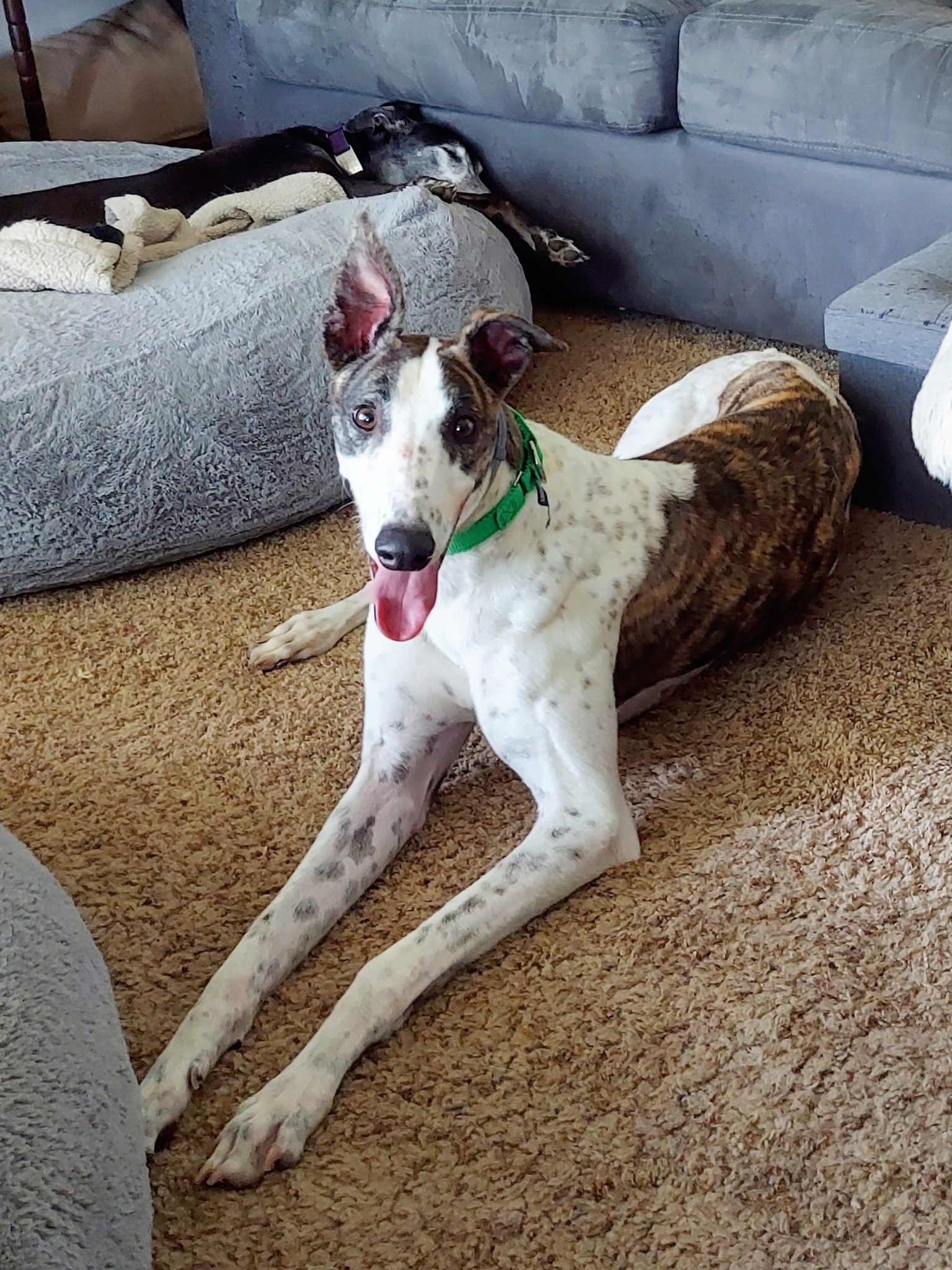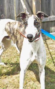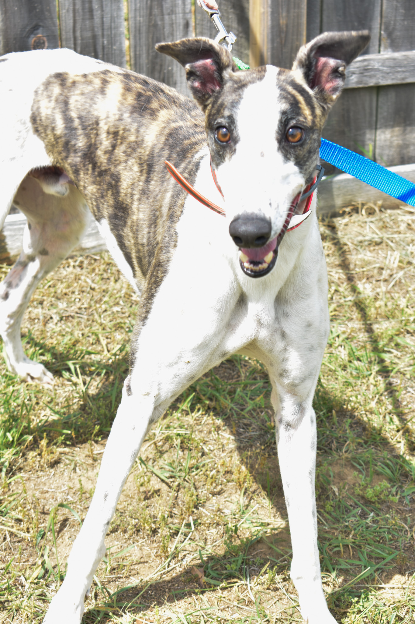 Duke is cat safe. He greets the geriatric cat in his foster home with sniffs and licks, but will chase anything that moves quickly, so a younger cat will likely need to reinforce its boundaries with a swat or two. He loves stealing the cat’s bowl and dish mat…he thinks he’s being sneaky about it, but he always gets caught. He gets along well with the other greyhounds in his foster home, and enjoys greeting the neighbor’s dog at the fence. He has a great little roo, and loves to sing with his foster dog siblings. Duke would likely enjoy being in a home with other dogs to keep him company, but he could do well as an only dog if his people aren’t out of the house for long periods of time. He just wants to be one of the gang – whether that is dogs, people, or both!