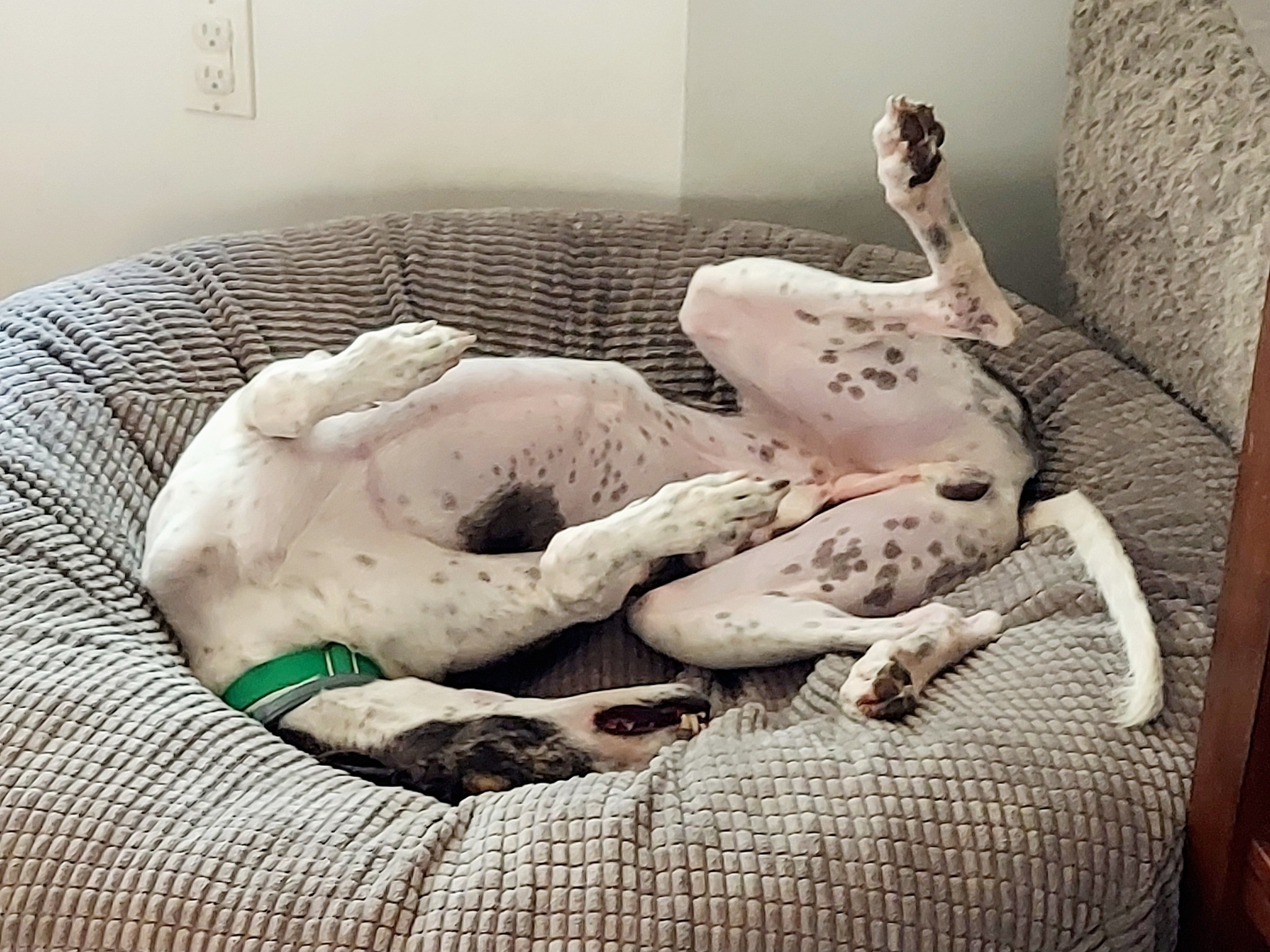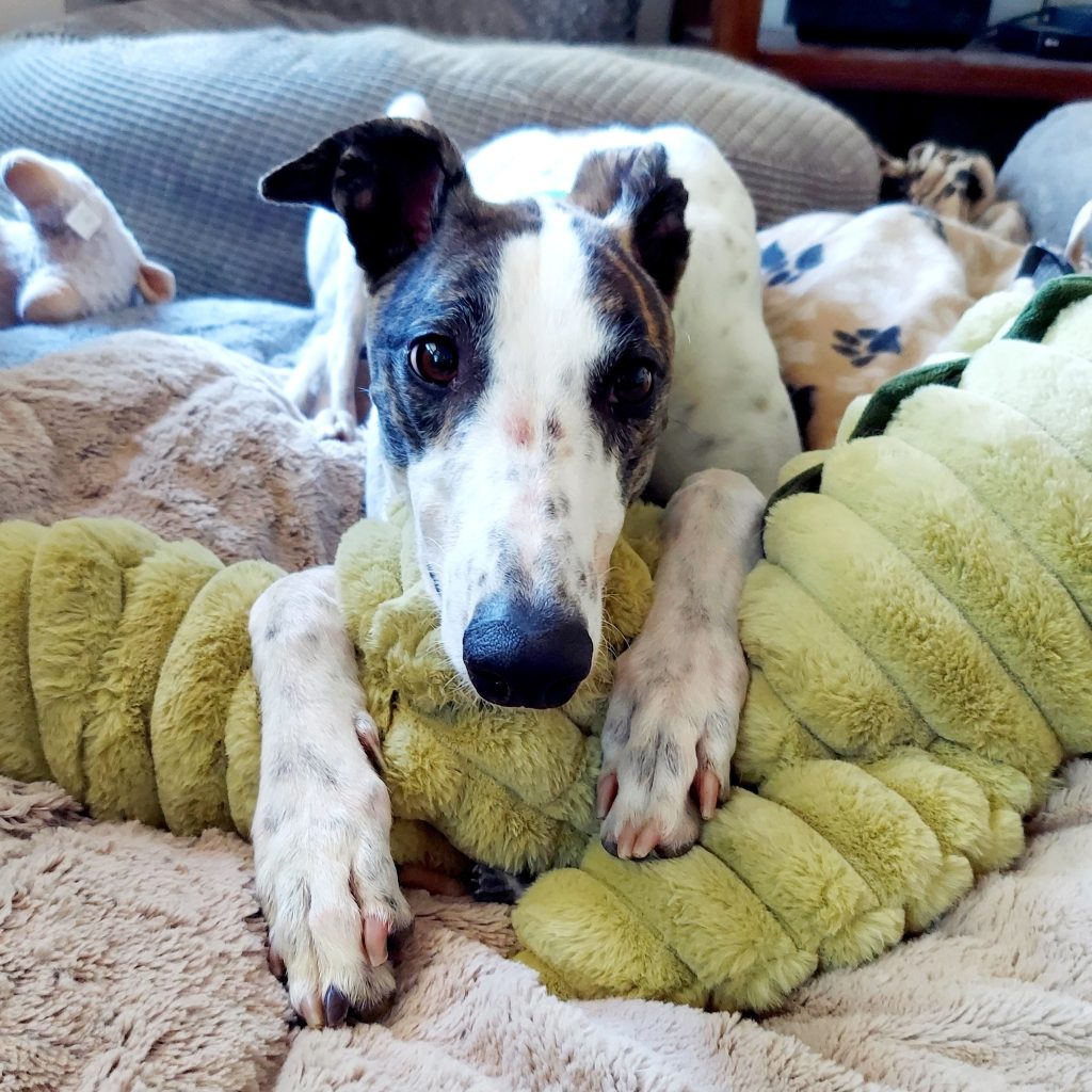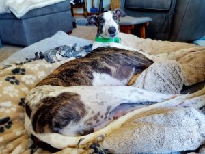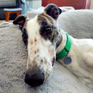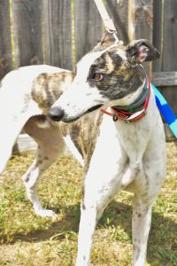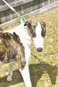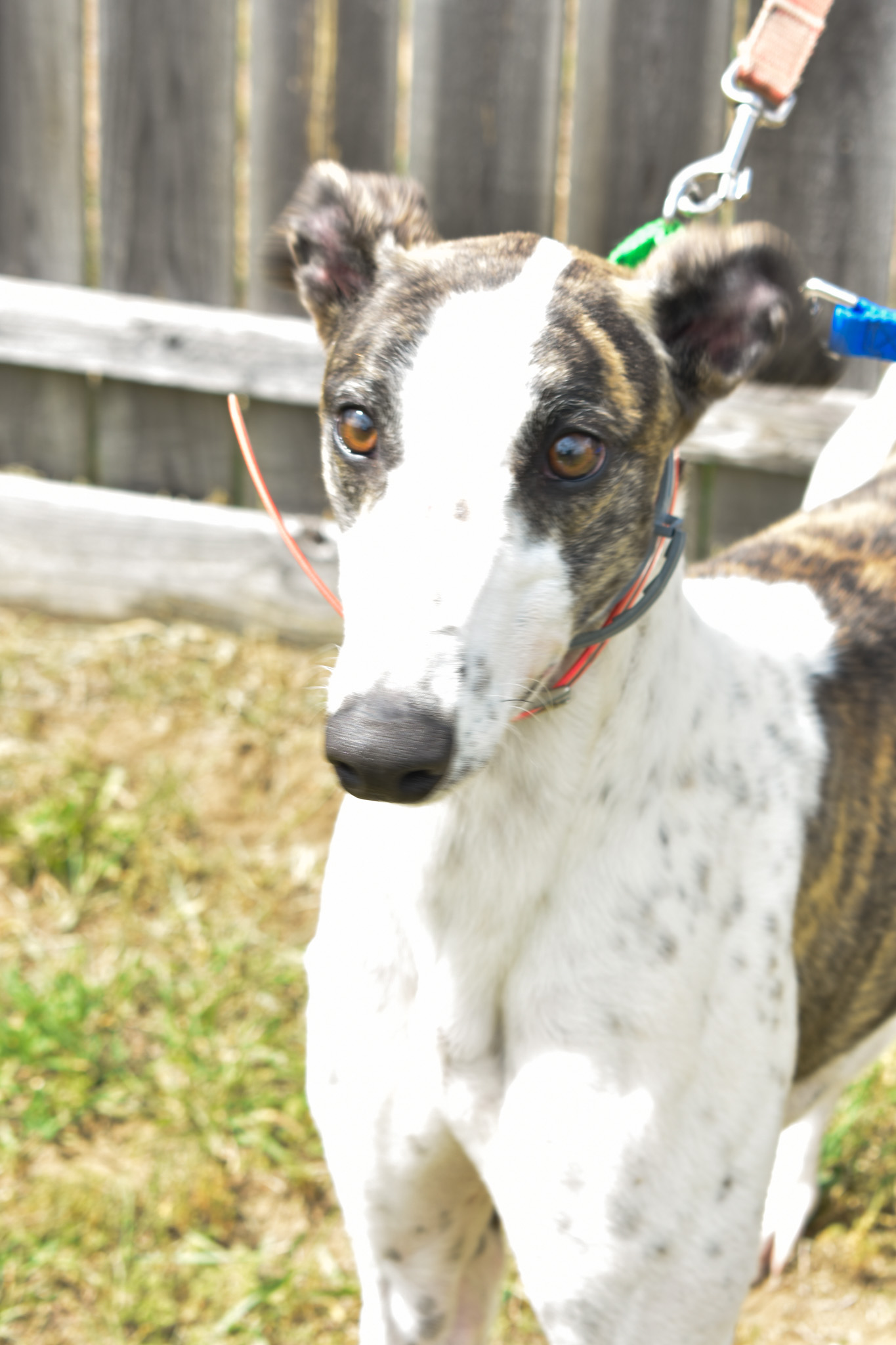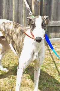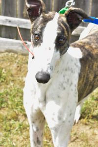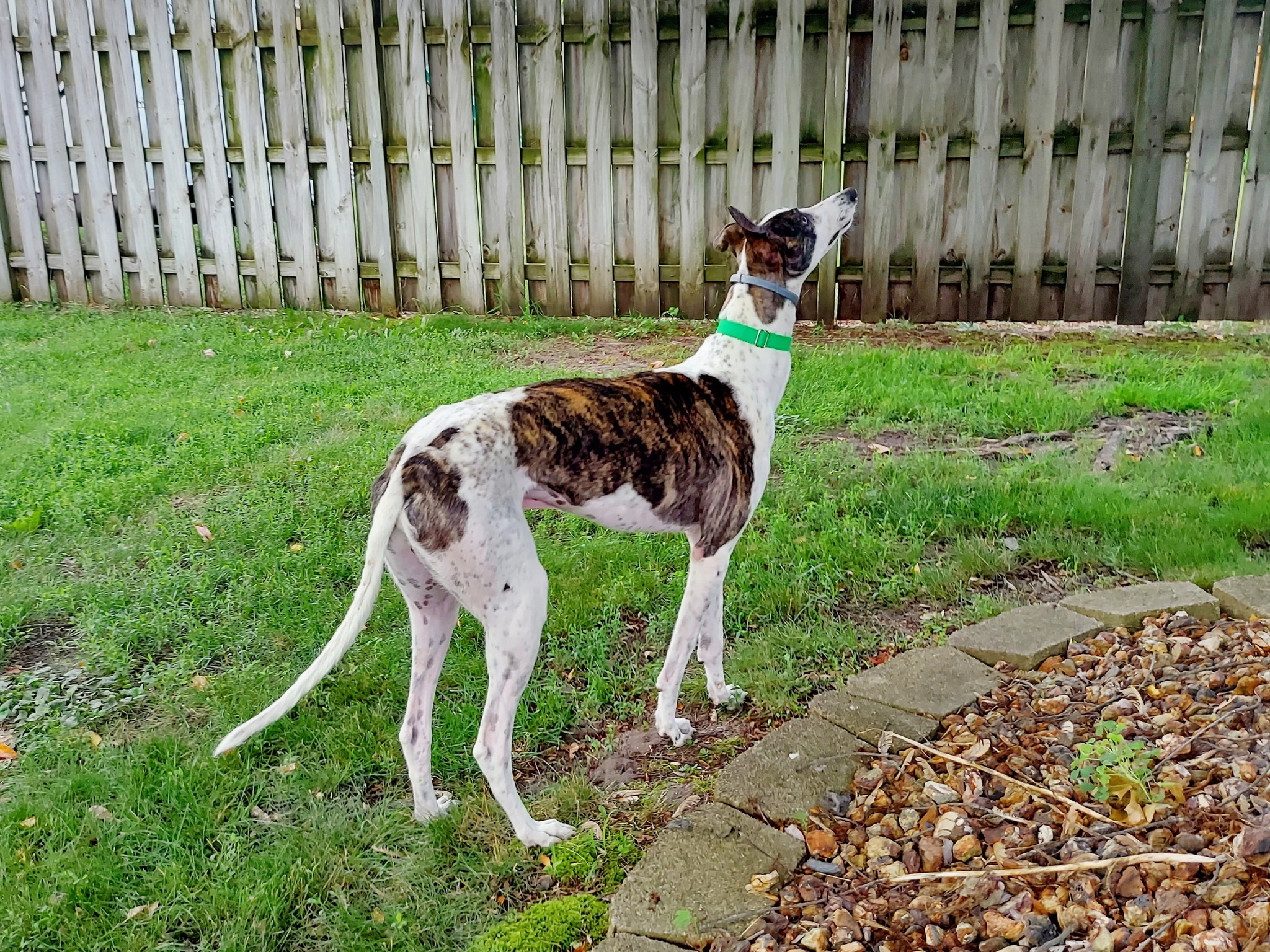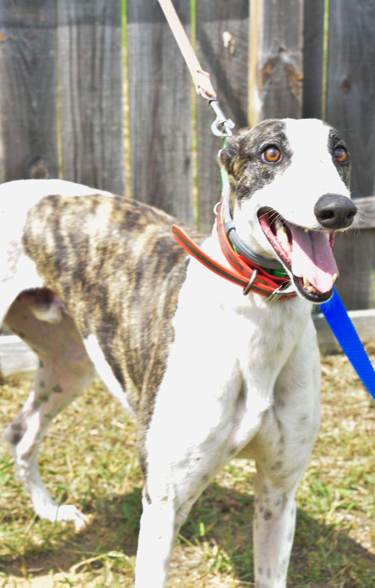 Duke is cat safe. He greets the geriatric cat in his foster home with sniffs and licks, but will chase anything that moves quickly, so a younger cat will likely need to reinforce its boundaries with a swat or two. He loves stealing the cat’s bowl and dish mat…he thinks he’s being sneaky about it, but he always gets caught. He gets along well with the other greyhounds in his foster home, and enjoys greeting the neighbor’s dog at the fence. He has a great little roo, and loves to sing with his foster dog siblings. Duke would likely enjoy being in a home with other dogs to keep him company, but he could do well as an only dog if his people aren’t out of the house for long periods of time. He just wants to be one of the gang – whether that is dogs, people, or both!