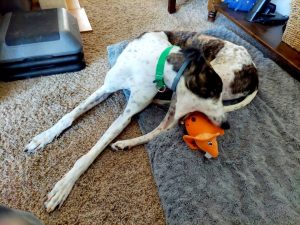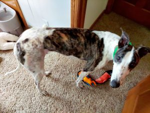 Duke loves attention and treats. He occasionally enjoys playing with toys, but he is sometimes surprised when they make noise. He is not as toy obsessed as some other greyhounds. He is an active boy and has plenty of energy. He would do well with activities to engage him mentally and physically throughout the day (training games, puzzles, short walks/sniffaris, nose-work). He is a relatively quick learner, but has a short attention span.