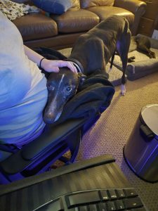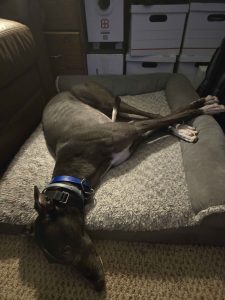 Aaron participated in 144 races, but now, he’s mostly ready to retire. His foster sister will try and get him to race, and he’ll run for a little while, but he’s done pretty quickly; “Why be outside when I could be inside where the food and snuggles are?”
