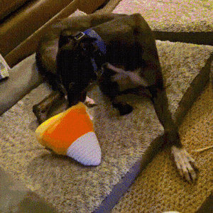Aaron is still learning about toys. He’s very fond of food puzzle toys, chewing toys, and prefers the crinkle over the squeakers. He’ll sit with a lick mat for hours, long after all the food is gone.