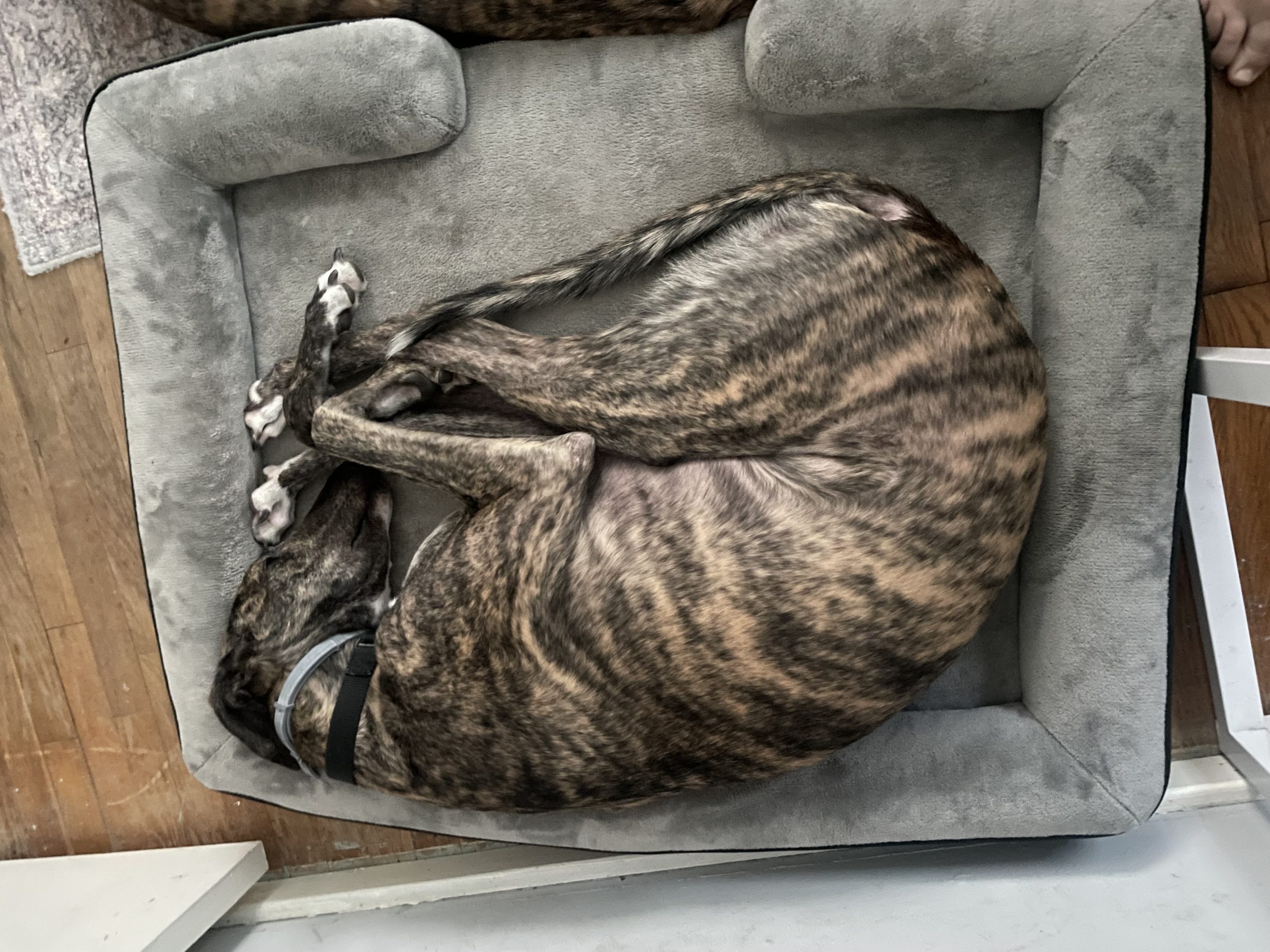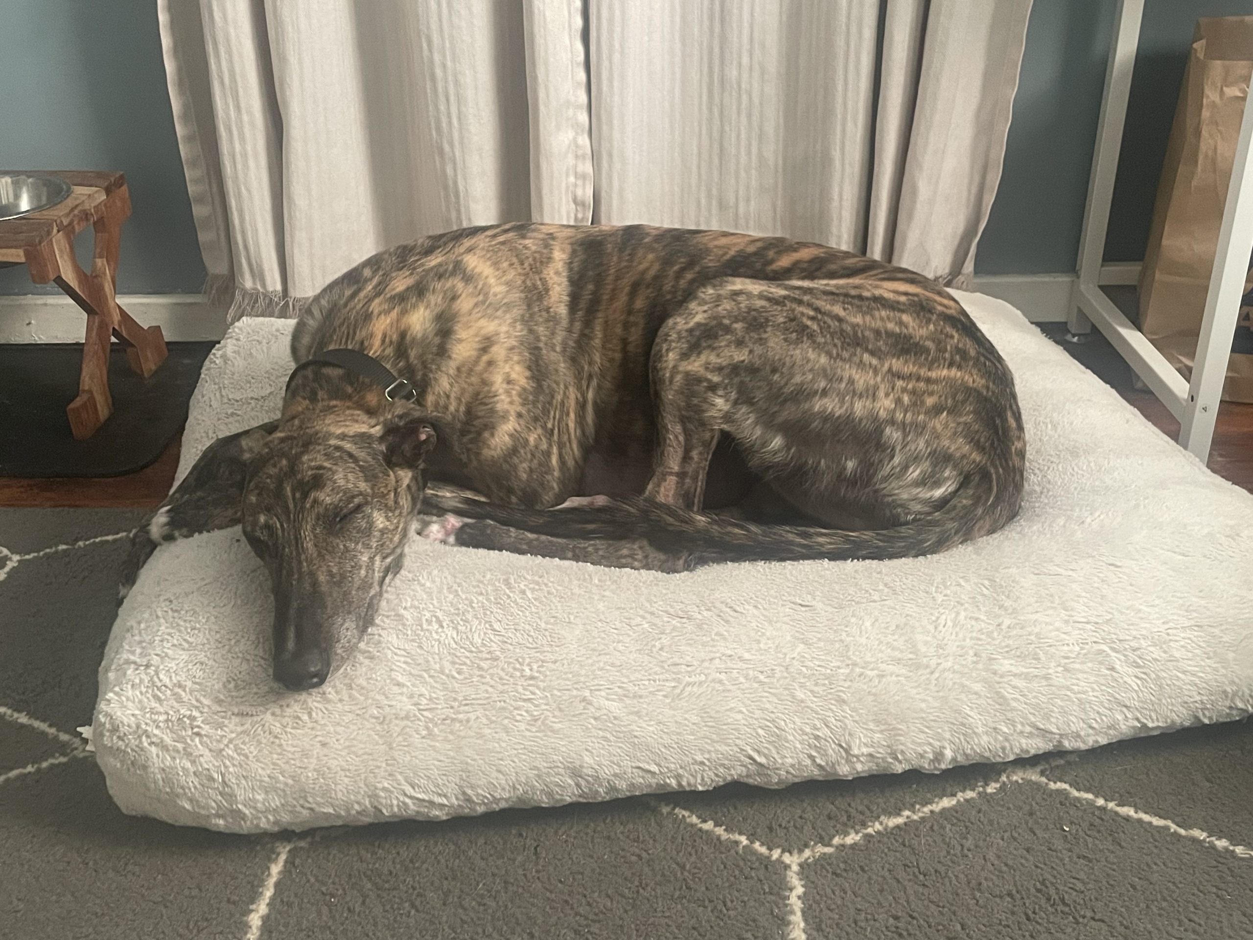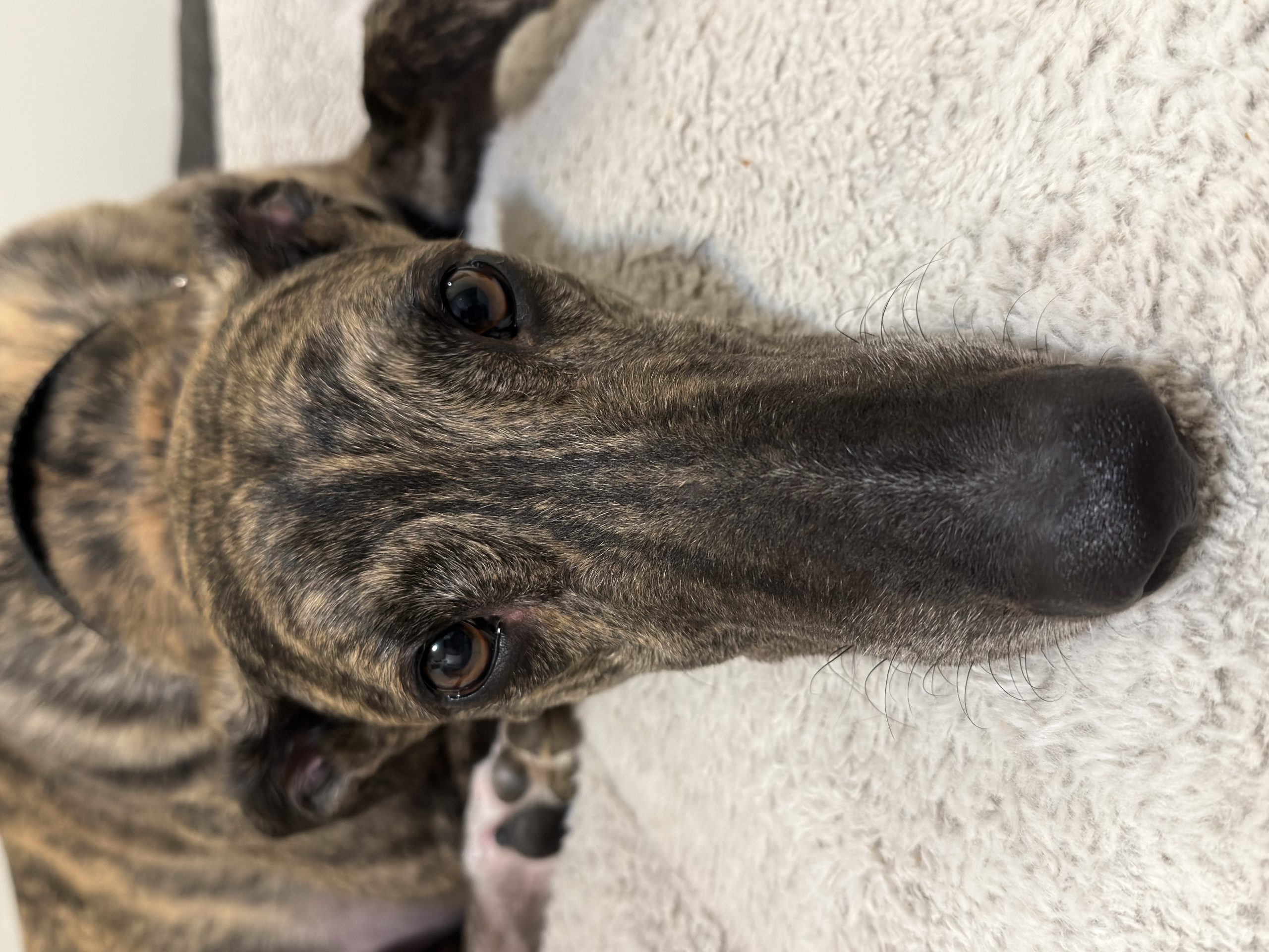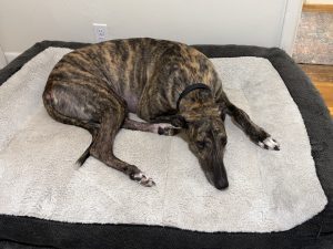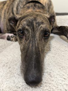 Patron is a very large, handsome greyhound with an easy-going personality and a lot of charm. He enjoys being around his people and likes to be part of whatever is going on in the home. Patron has a great balance of energy and relaxation—he’s happy to head out for a long walk and explore, but he’s just as content with a shorter stroll followed by an evening relaxing next to the couch.